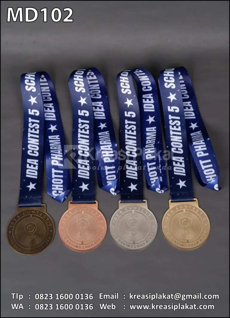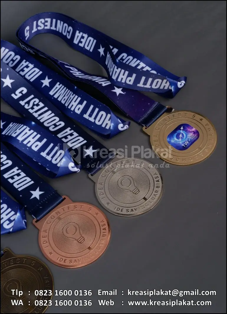 Berikut contoh Medali Logam Idea Contest 5 yang terbuat dari bahan logam kuningan finishing etsa masir chrome gold, silver, bronze dengan bentuk desain custom yang sudah disesuaikan. Untuk bagian kalung medali menggunakan bahan satin materi printing.