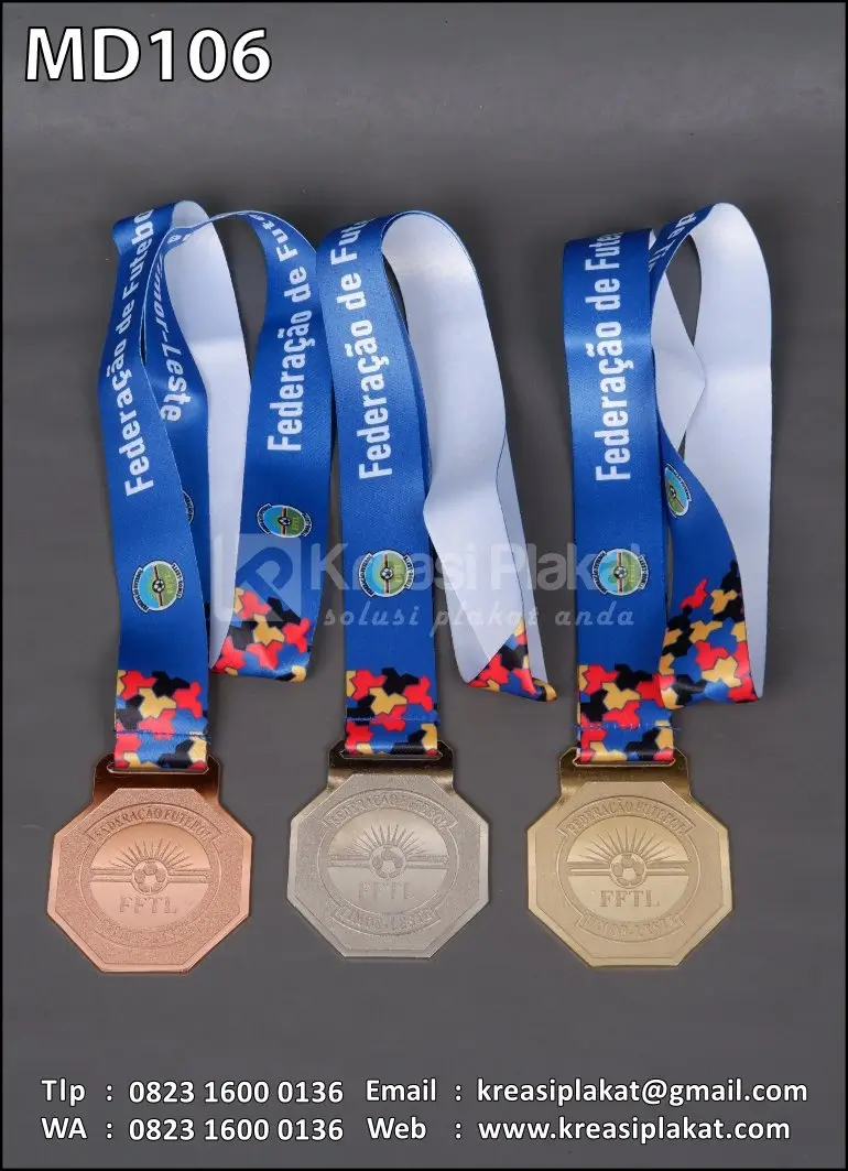 Berikut contoh Medali Logam Sepak Bola Copa Juvenil U-15 Feminino yang terbuat dari bahan logam kuningan finishing etsa masir chrome gold, silver, bronze dengan bentuk desain custom yang sudah disesuaikan. Untuk bagian kalung medali menggunakan bahan satin materi printing.