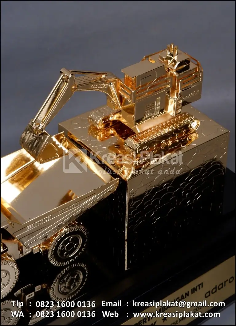 Salah satu bentuk cinderamata custom eksklusif yang diaplikasikan dalam sebuah miniatur. Miniatur dengan konsep yang sudah disesuaikan. Terbuat dari bahan logam kuningan finishing etsa chrome emas glossy model desain custom alat berat pertambangan dump truk & excavator. Untuk bagian dudukan menggunakan bahan kayu finishing warna hitam doff disertai plat kuningan etsa.