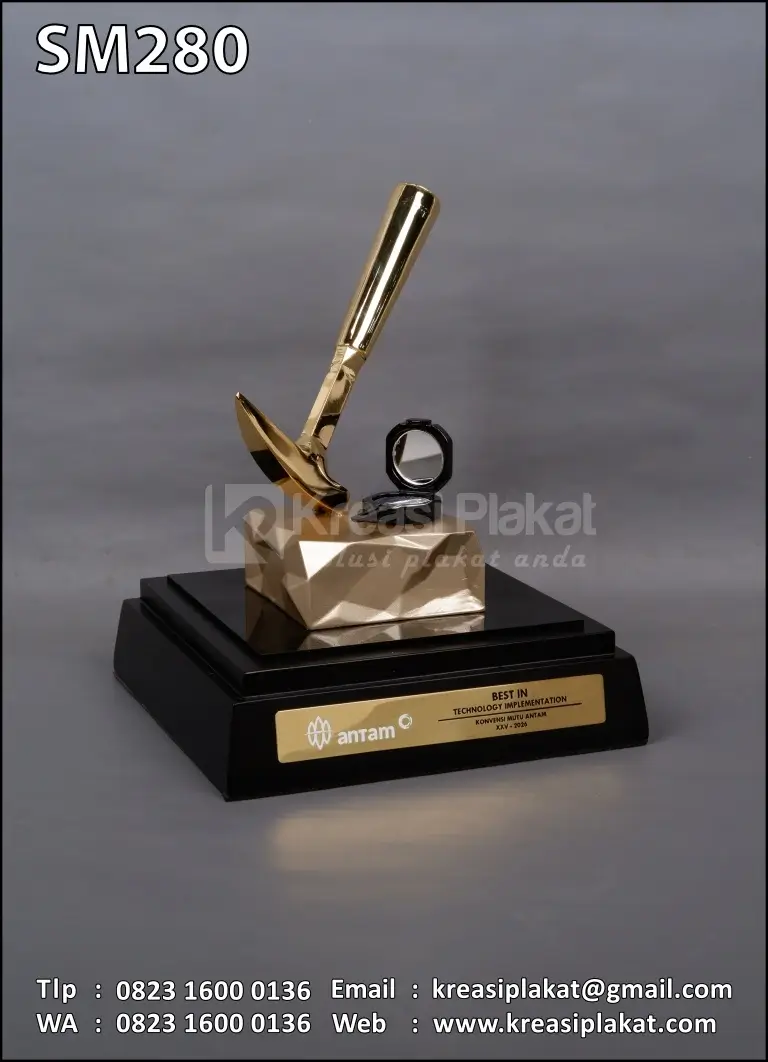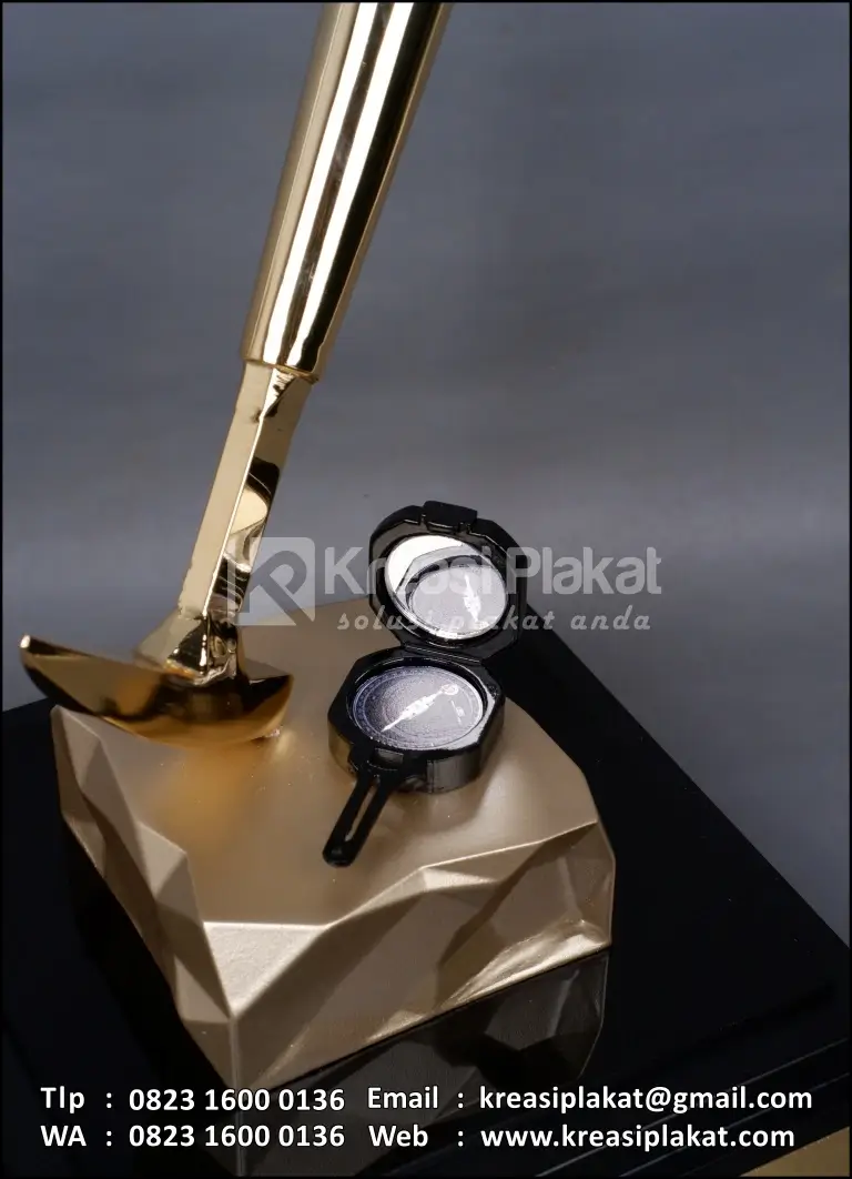 Salah satu bentuk cinderamata custom eksklusif yang diaplikasikan dalam sebuah miniatur. Miniatur alat geologi ini dirancang dengan konsep detail yang merepresentasikan simbol ketangguhan, eksplorasi, dan akurasi di industri pertambangan. Terbuat dari logam kuningan chrome emas mengkilap yang secara presisi membentuk replika palu geologi dan kompas ukur. Tampilan gold finish secara keseluruhan dipadukan dengan alas logam berbentuk geometris abstrak memberikan kesan yang sangat mewah, elegan, dan berkarakter. Untuk bagian dudukan utama menggunakan bahan kayu finishing warna hitam doff disertai plat kuningan etsa custom untuk mencetak pesan penghargaan eksklusif Anda.