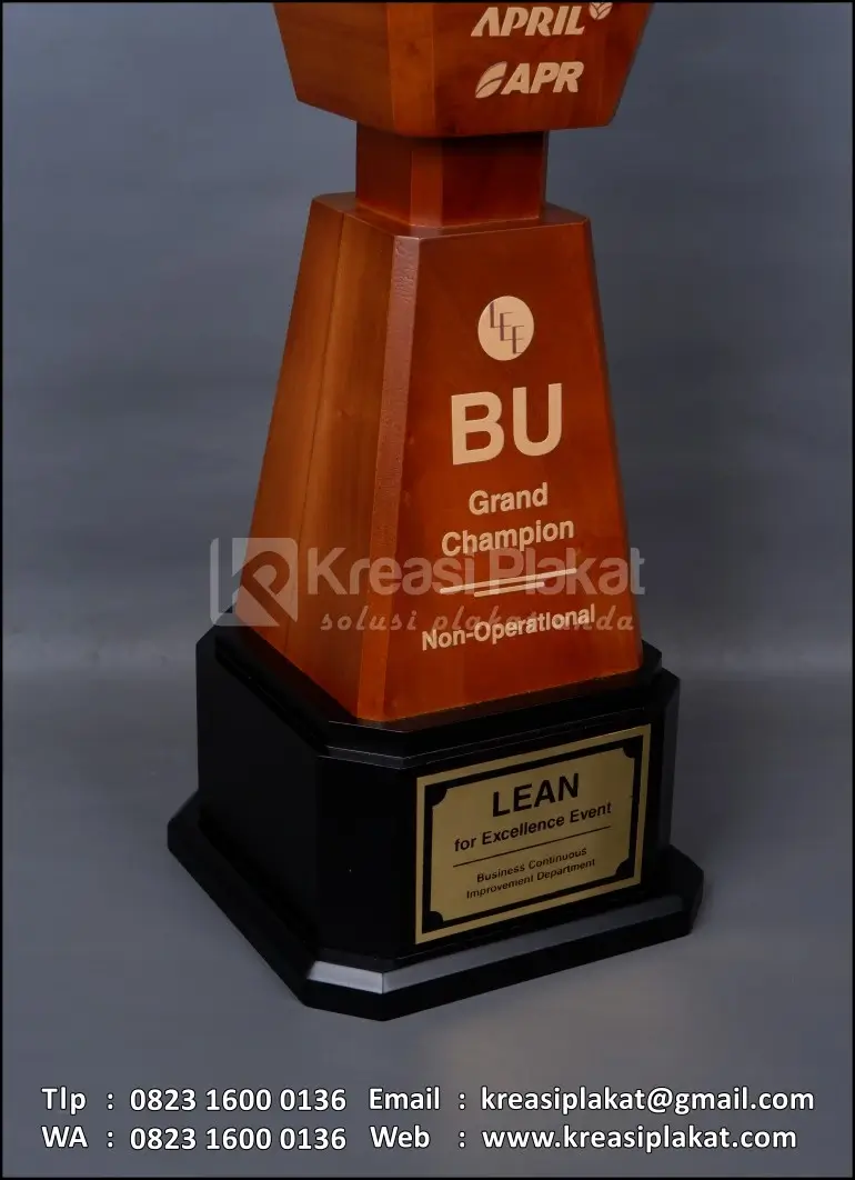 Sebagai bentuk penghargaan bergengsi dalam suatu momen atau acara, kehadiran piala memang paling yang dinantikan. Contoh berikut merupakan Piala Custom BU Grand Champion. Piala yang bisa dijadikan pilihan referensi desain untuk Anda. Terbuat dari perpaduan bahan akrilik kombinasi logam kuningan chrome + kayu solid materi uv print model desain custom. Untuk bagian dudukan menggunakan material kayu solid hitam doff.