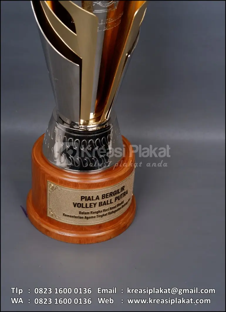 Sebagai bentuk penghargaan bergengsi dalam suatu momen atau acara, kehadiran piala memang paling yang dinantikan. Contoh berikut merupakan Piala Logam Bergilir Volley Ball Putra. Piala yang bisa dijadikan pilihan referensi desain untuk Anda. Terbuat dari bahan logam kuningan finishing etsa chrome emas dan nickel model desain custom. Untuk bagian dudukan menggunakan material kayu finishing natural.