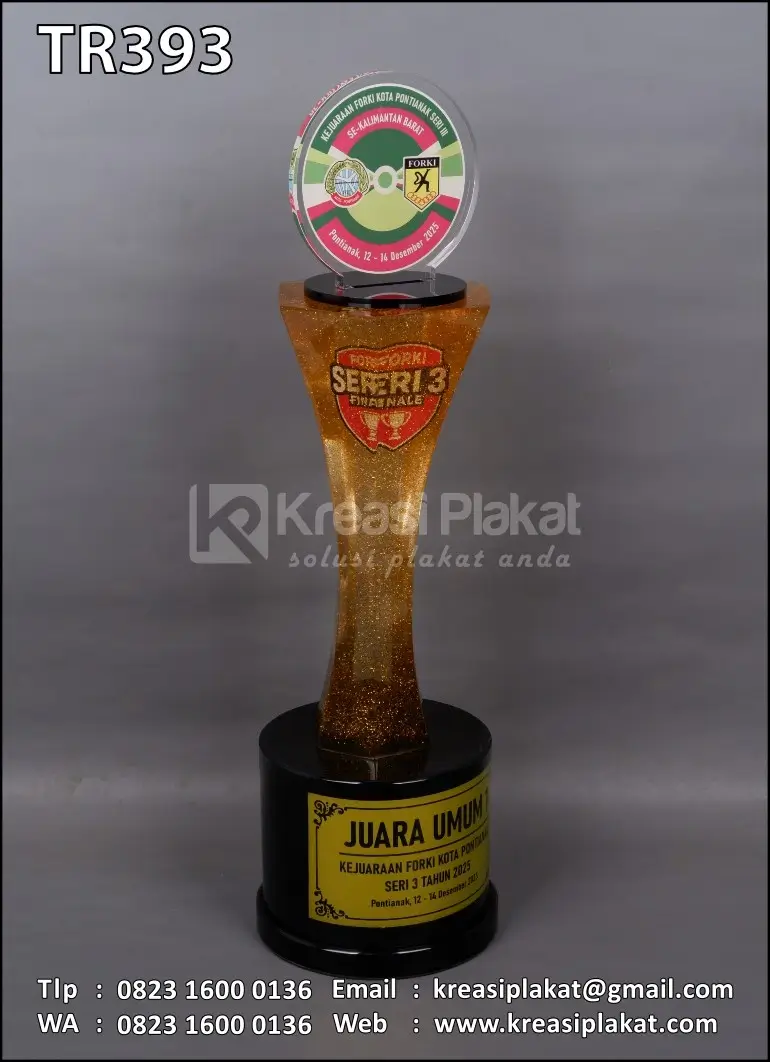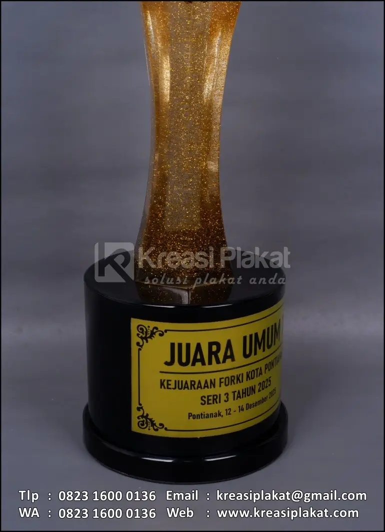 Sebagai bentuk penghargaan bergengsi dalam suatu momen atau acara, kehadiran piala memang paling yang dinantikan. Contoh berikut merupakan Piala Resin Juara Umum Kejuaraan Forki Kota Pontianak. Piala yang bisa dijadikan pilihan referensi desain untuk Anda. Terbuat dari bahan resin cor kombinasi glitter emas + kombinasi akrilik uv print model desain custom. Untuk bagian dudukan menggunakan material resin solid hitam doff.