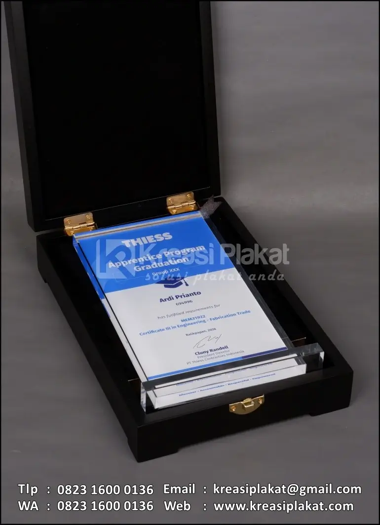 Salah satu bentuk cinderamata penghargaan program pelatihan profesional yang minimalis dan modern menggunakan plakat sebagai medianya. Plakat kode PA355 ini bisa jadi pilihan referensi desain gift kelulusan program magang (apprentice program) atau sertifikasi perusahaan untuk instansi Anda. Terbuat dari bahan dasar akrilik bening (clear) berpotongan persegi panjang yang sangat rapi dan presisi. Menampilkan desain visual bernuansa biru dan putih yang dicetak menggunakan teknik uv print berkualitas tinggi, lengkap dengan elemen topi toga, logo perusahaan, detail nama penerima, serta keterangan sertifikasi kompetensi. Untuk bagian dudukan, plakat ini juga menggunakan bahan akrilik bening tebal yang senada, memberikan kesan clean, rapi, dan elegan.