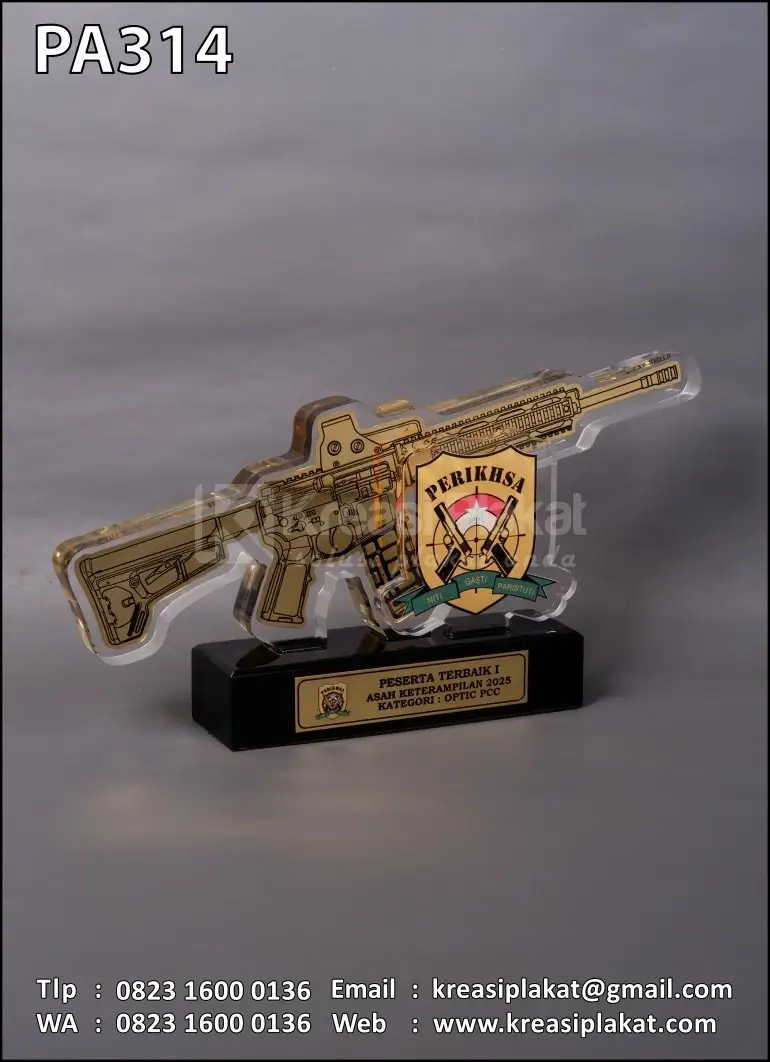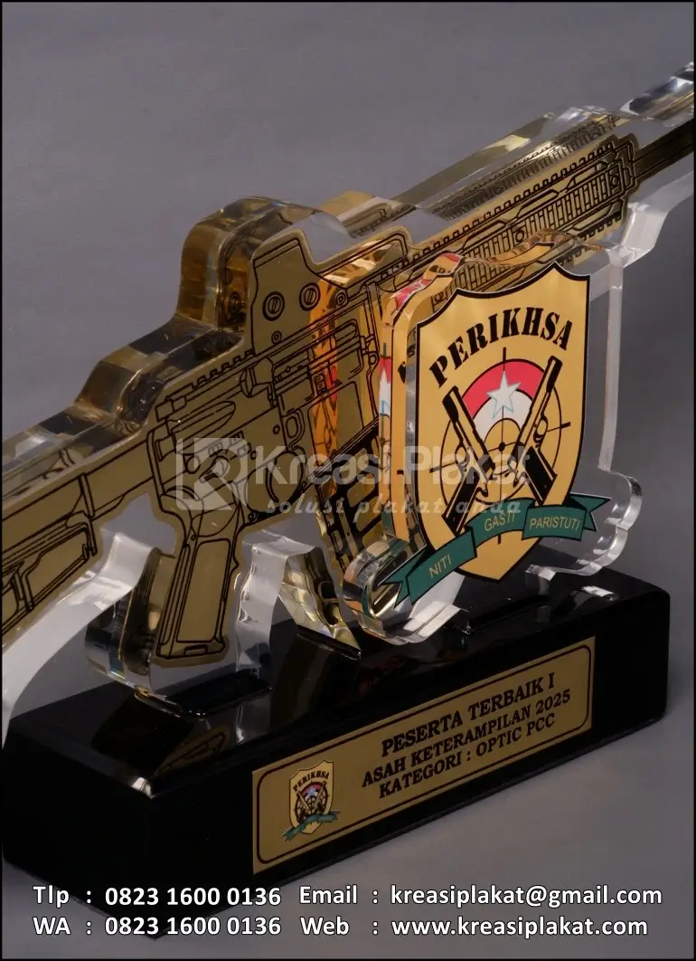 Salah satu bentuk tanda penghargaan peserta terbaik 1 asah keterampilan kategori optic pcc yang menggunakan plakat sebagai medianya. Plakat yang bisa jadi pilihan referensi desain untuk Anda. Terbuat dari bahan dasar akrilik bening dan kombinasi logam kuningan etsa model desain custom yang sudah disesuaikan. Untuk bagian dudukan menggunakan bahan resin hitam doff.