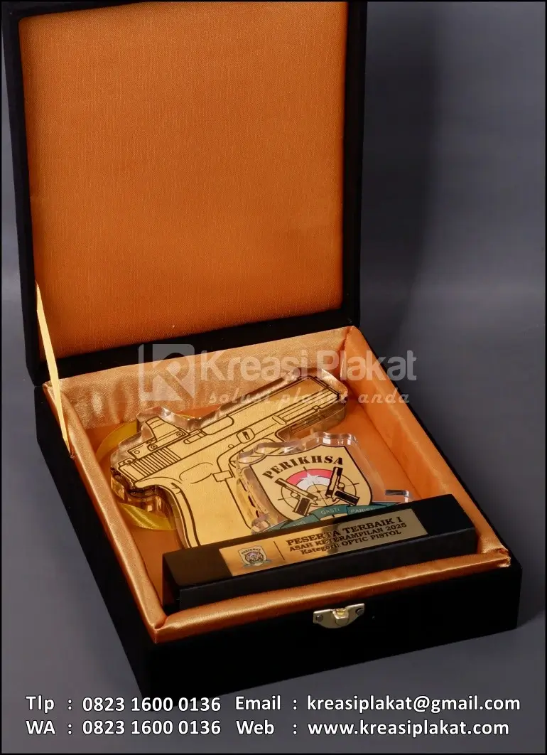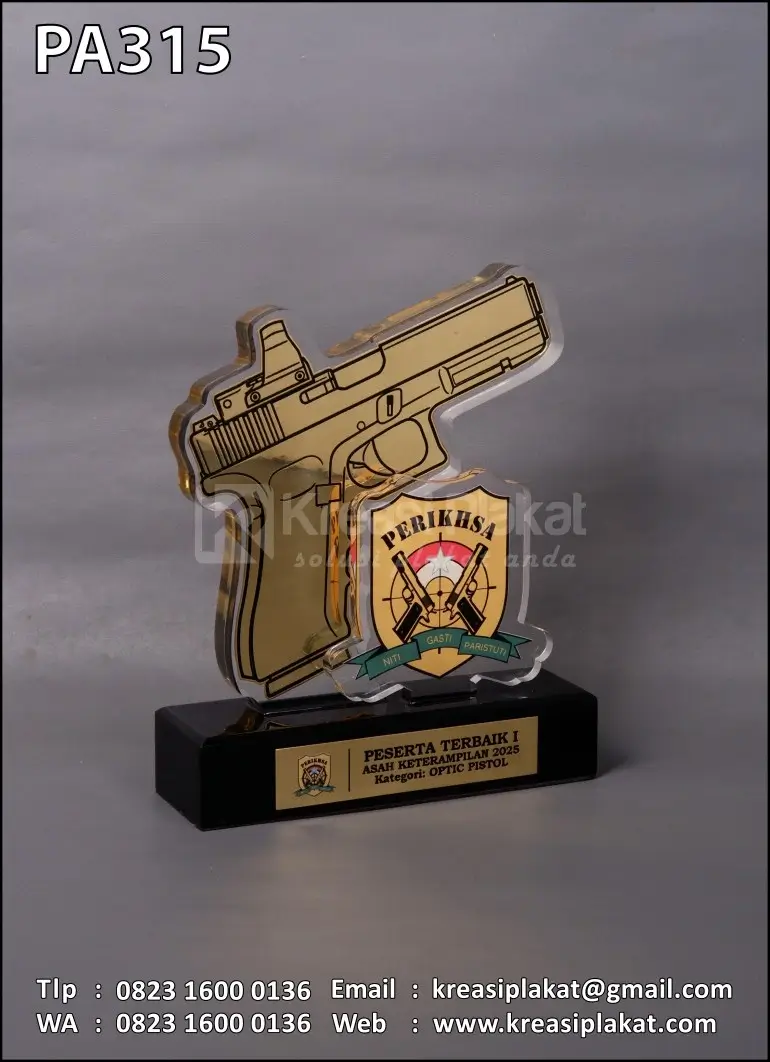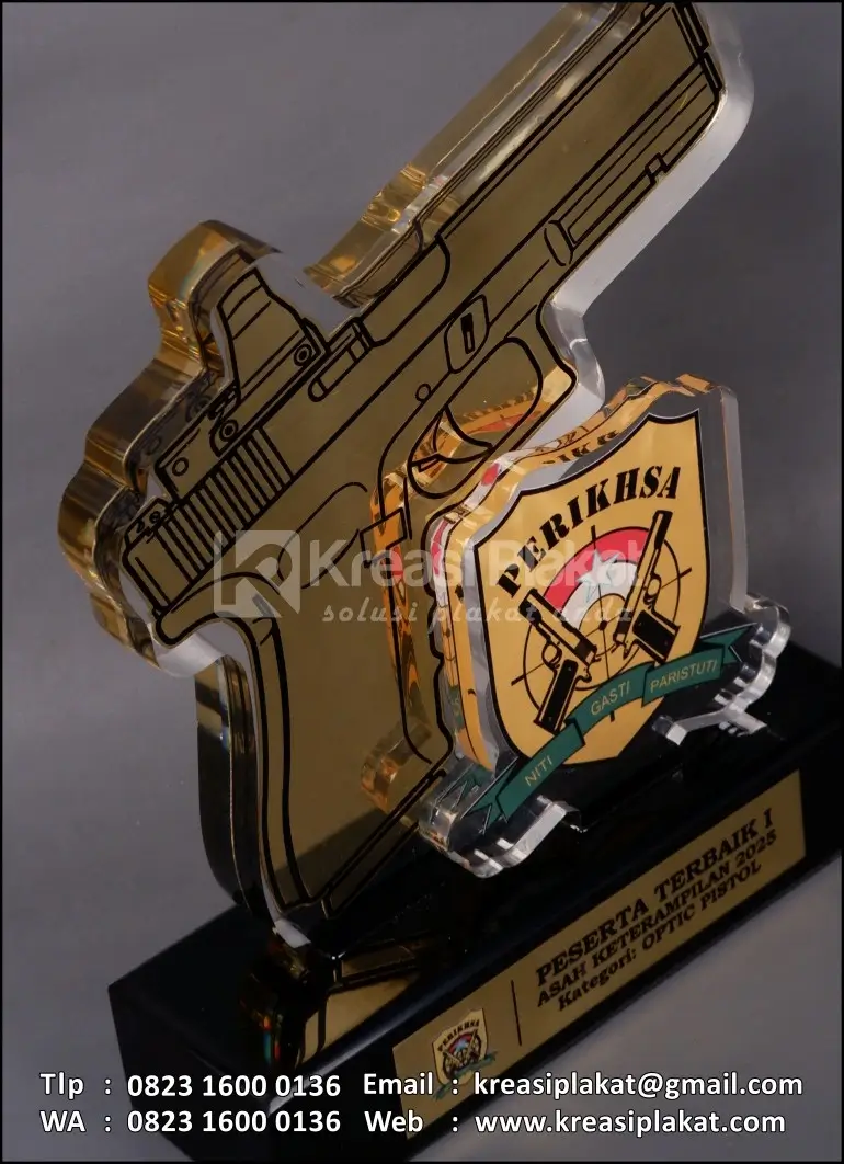 Salah satu bentuk tanda penghargaan peserta terbaik 1 asah keterampilan kategori optic pistol yang menggunakan plakat sebagai medianya. Plakat yang bisa jadi pilihan referensi desain untuk Anda. Terbuat dari bahan dasar akrilik bening dan kombinasi logam kuningan etsa model desain custom yang sudah disesuaikan. Untuk bagian dudukan menggunakan bahan resin hitam doff.