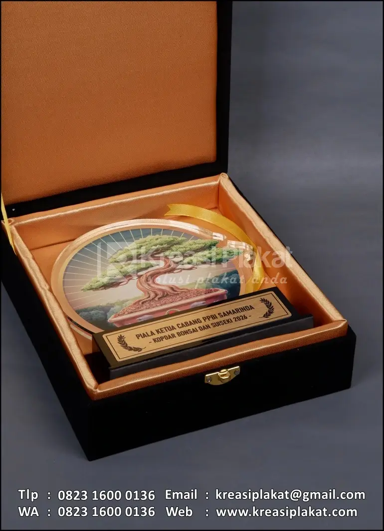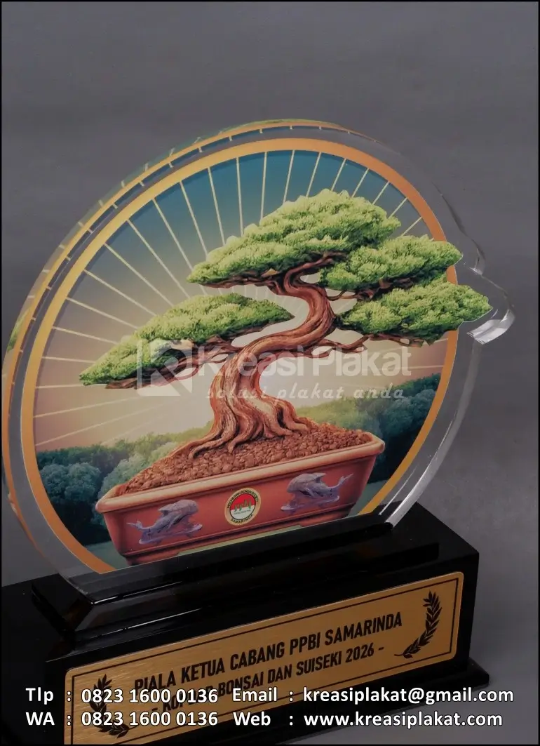 Plakat ini menampilkan visual ilustrasi pohon bonsai yang sangat detail, estetik, dan full color berlatar belakang siluet pancaran sinar, dicetak menggunakan teknik uv print berkualitas tinggi sehingga warnanya tajam, hidup, dan tahan lama. Untuk bagian dudukan, menggunakan bahan solid hitam mengkilap bersusun yang menopang bodi plakat dengan kokoh, dilengkapi plat berwarna emas (kuningan) untuk mengukir detail nama kejuaraan secara elegan.