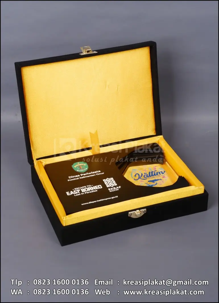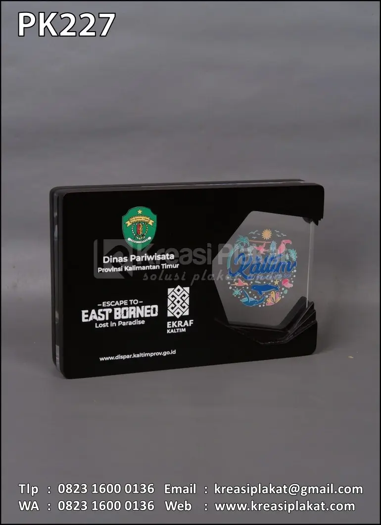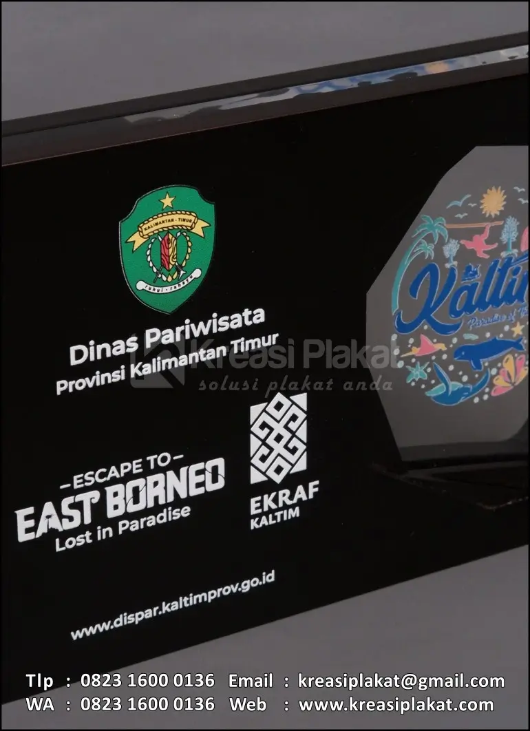 Salah satu bentuk cinderamata kenang-kenangan Dinas Pariwisata Provinsi Kalimantan Timur yang menggunakan plakat sebagai medianya. Plakat yang bisa di jadikan referensi desain untuk Anda. Terbuat dari bahan dasar kayu finishing hitam doff model desain custom rangkap/lapis (oreo) dengan bahan akrilik bening. Untuk materi teks & gambar logo pada plakat menggunakan teknik uv print.