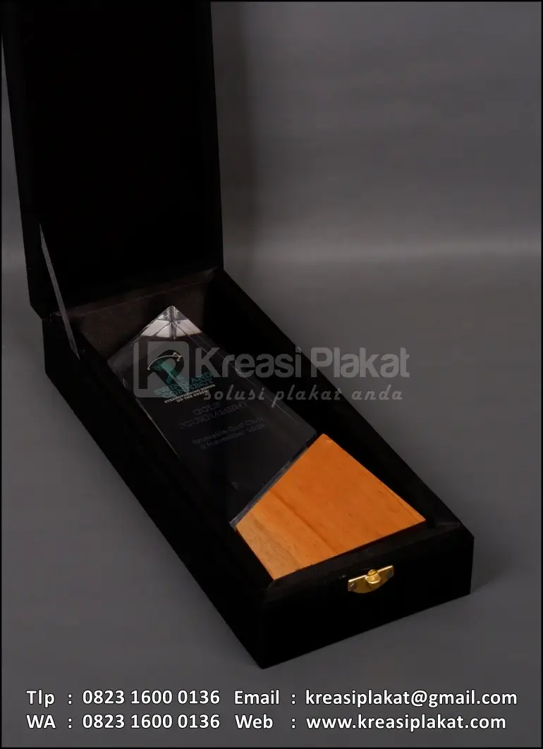 Salah satu bentuk cinderamata custom yang menggunakan plakat sebagai medianya. Plakat yang bisa dijadikan referensi desain untuk Anda. Terbuat dari bahan kayu coklat + kombinasi akrilik bening materi uv print model desain custom