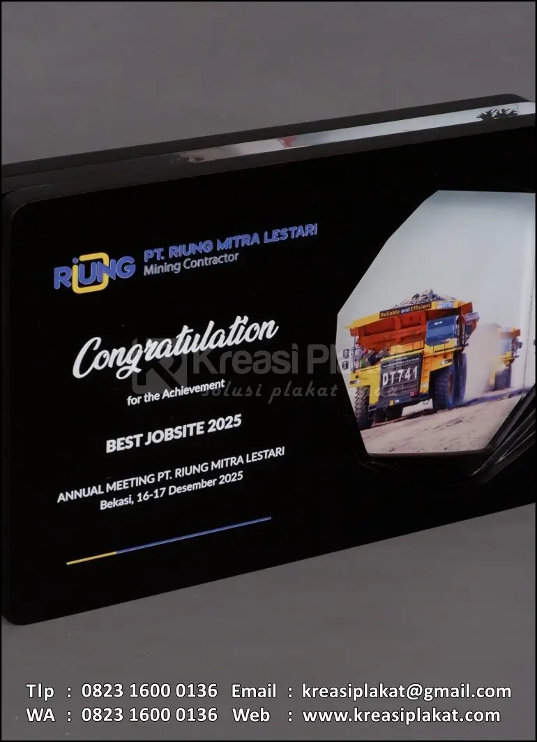 Salah satu bentuk cinderamata custom yang menggunakan plakat sebagai medianya. Plakat yang bisa dijadikan referensi desain untuk Anda. Terbuat dari bahan kayu finishing hitam doff + kombinasi akrilik uv print model desain custom rangkap lapis atau oreo.