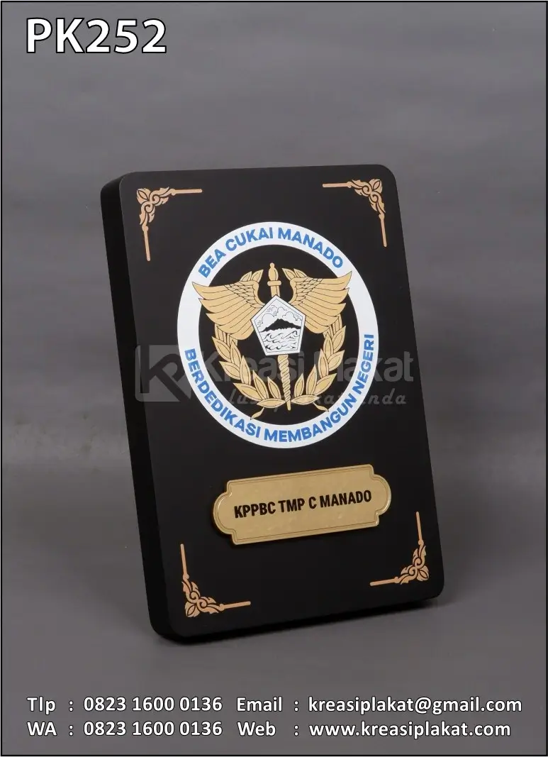 Salah satu bentuk cinderamata custom yang menggunakan plakat sebagai medianya. Plakat yang bisa dijadikan referensi desain untuk Anda. Terbuat dari bahan dasar kayu finishing hitam doff + logam kuningan finishing etsa chrome emas model desain custom.