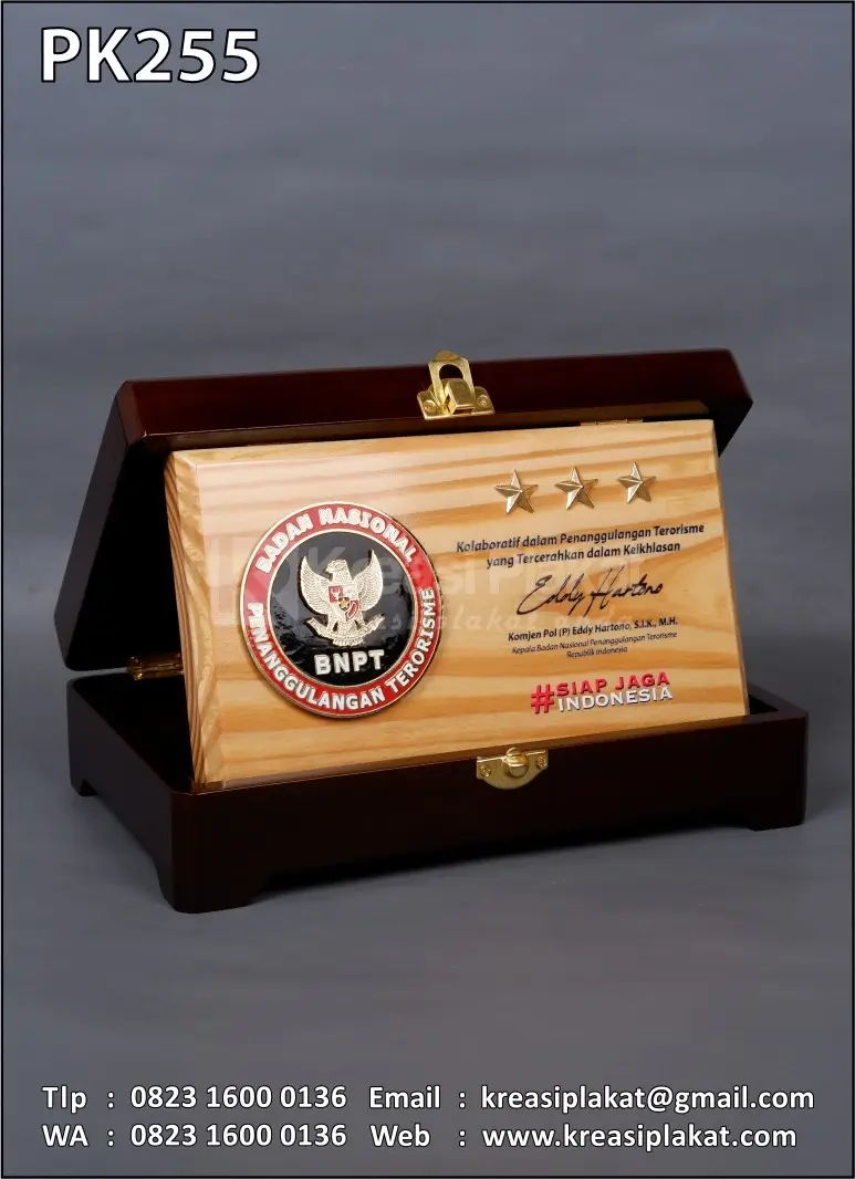 Salah satu bentuk cinderamata custom yang menggunakan plakat sebagai medianya. Plakat yang bisa dijadikan referensi desain untuk Anda. Terbuat dari bahan dasar kayu finishing coklat doff model desain box + kombinasi logam etsa cat logo bnpt.