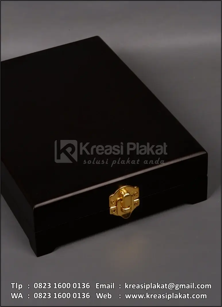 Salah satu bentuk cinderamata custom yang menggunakan plakat sebagai medianya. Plakat yang bisa dijadikan referensi desain untuk Anda. Terbuat dari bahan dasar kayu finishing hitam doff model desain box + kombinasi logam kuningan etsa chrome model desain logo.