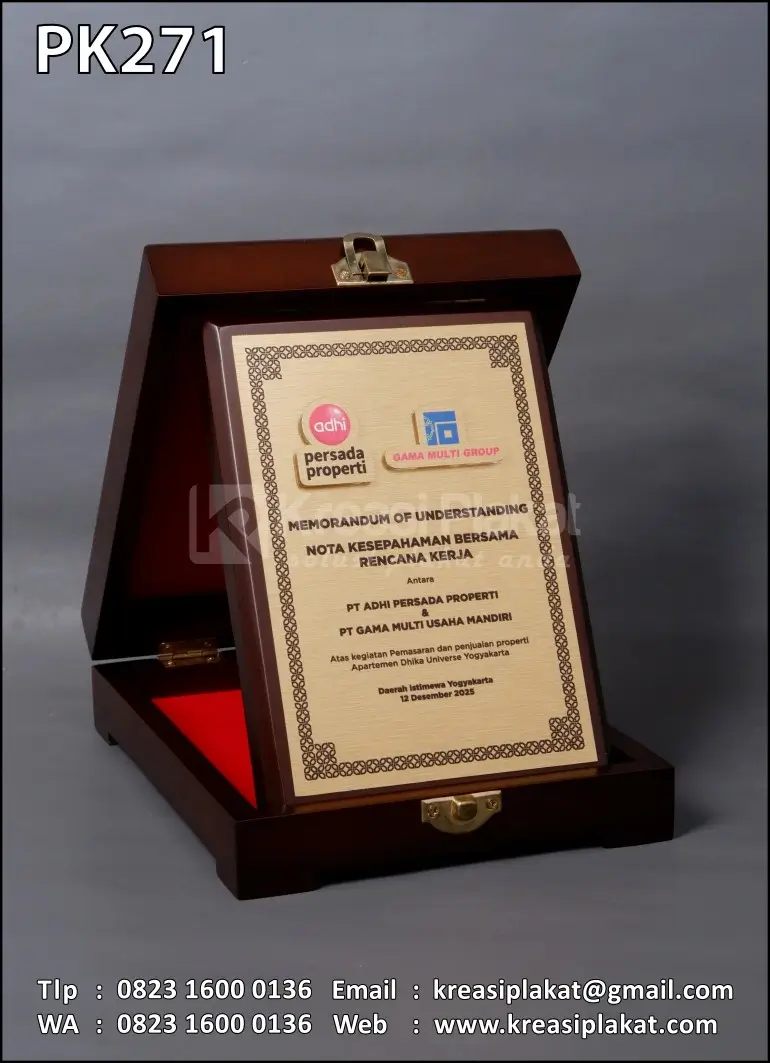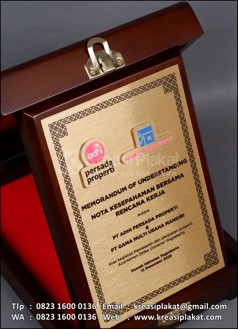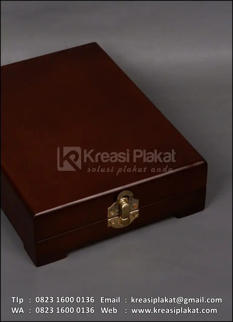 Salah satu bentuk cinderamata custom yang menggunakan plakat sebagai medianya. Plakat yang bisa dijadikan referensi desain untuk Anda. Terbuat dari bahan kayu finishing coklat doff model desain box + kombinasi logam kuningan etsa chrome emas glossy.