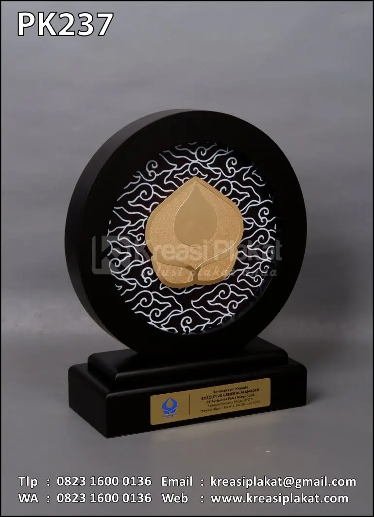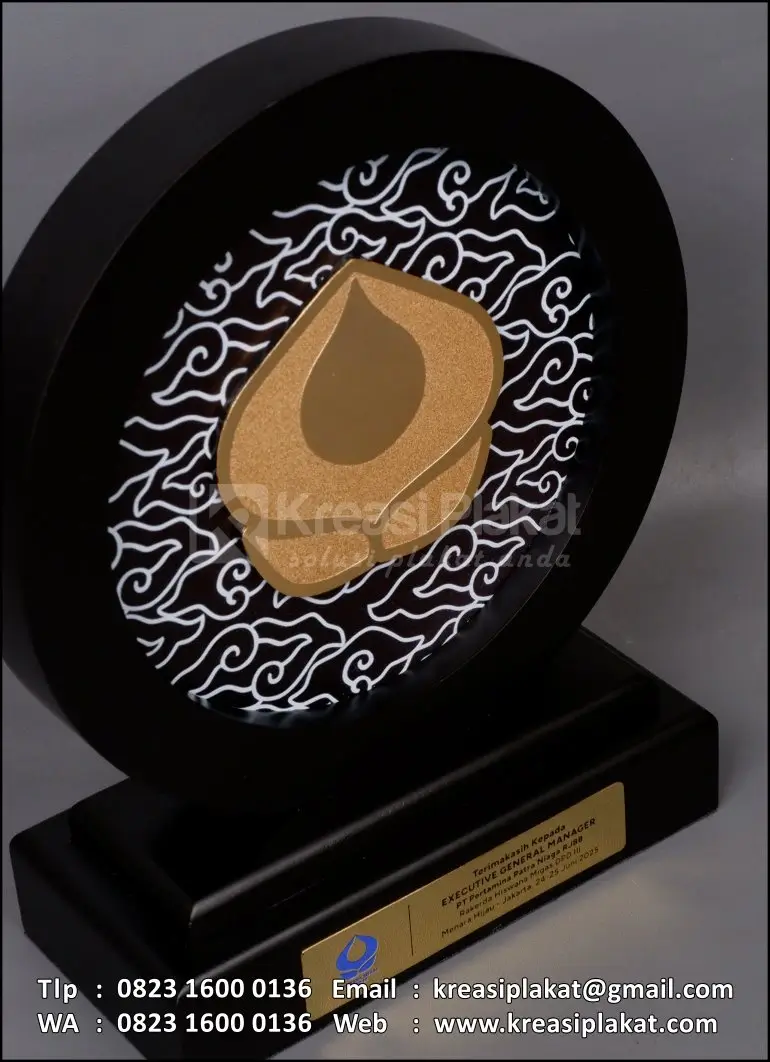Salah satu bentuk cinderamata ucapan terima kasih dari PT Pertamina Patra Niaga yang menggunakan plakat sebagai medianya. Plakat yang bisa di jadikan referensi desain untuk Anda. Terbuat dari bahan dasar kayu finishing hitam doff model desain custom bulat motif awan megamendung dan kombinasi logo logam kuningan esta masir.