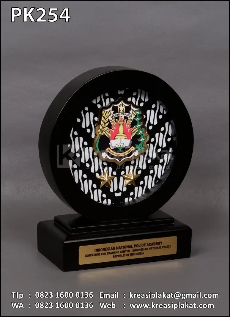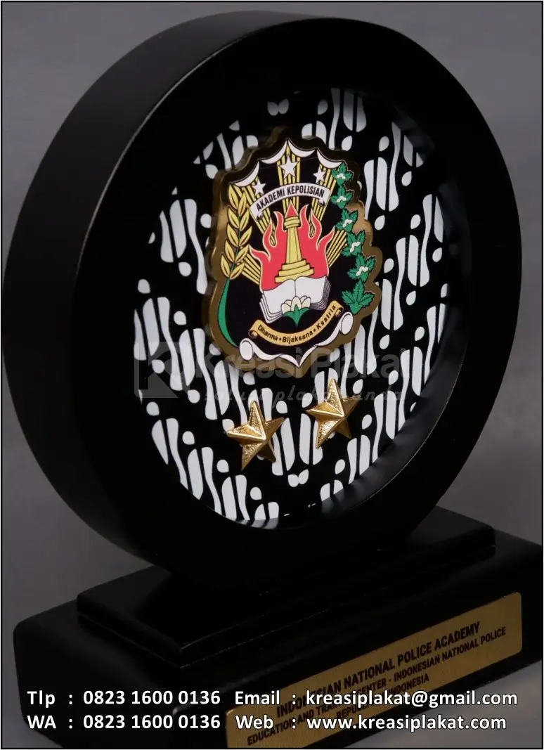 Salah satu bentuk cinderamata custom yang menggunakan plakat sebagai medianya. Plakat yang bisa dijadikan referensi desain untuk Anda. Terbuat dari bahan dasar kayu finishing hitam doff model desain bulat kombinasi logam kuningan etsa cat bentuk logo.