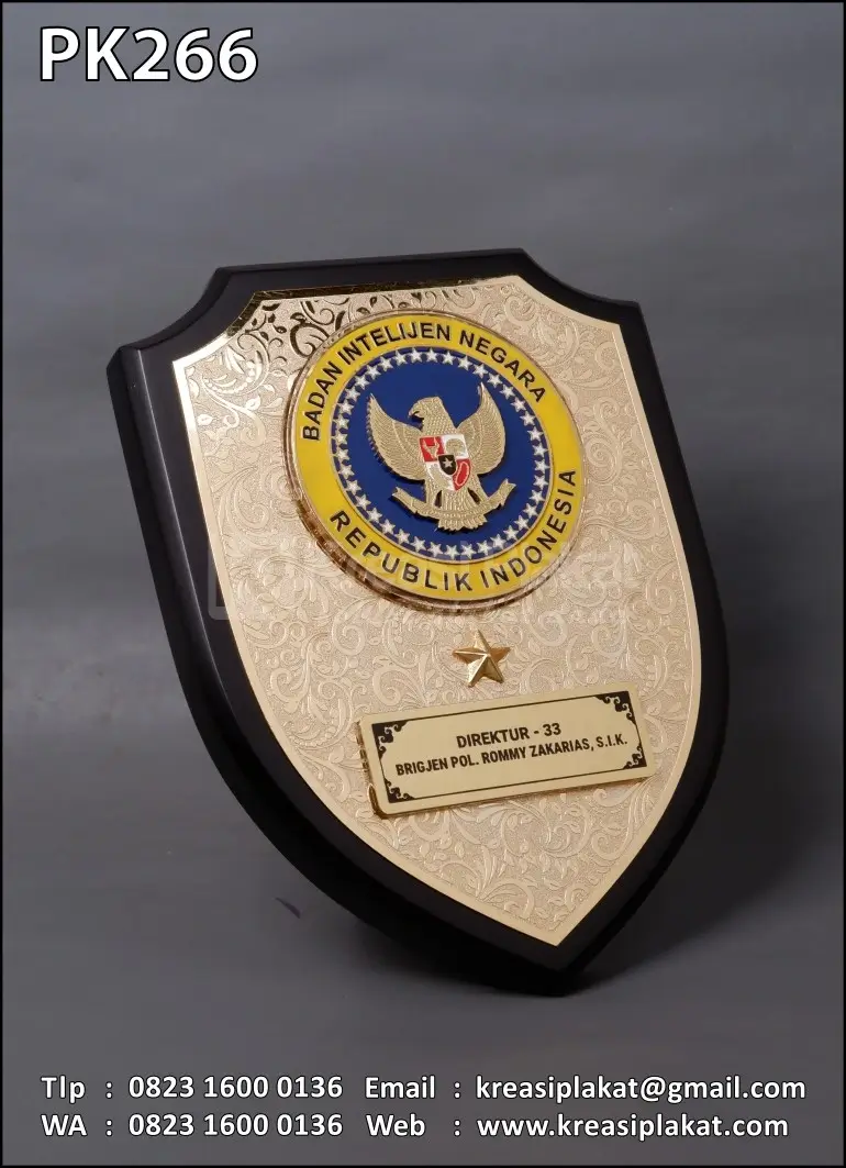 Salah satu bentuk cinderamata custom yang menggunakan plakat sebagai medianya. Plakat yang bisa dijadikan referensi desain untuk Anda. Terbuat dari bahan kayu finishing hitam doff + kombinasi logam kuningan etsa cat & chrome emas glossy model desain perisai.