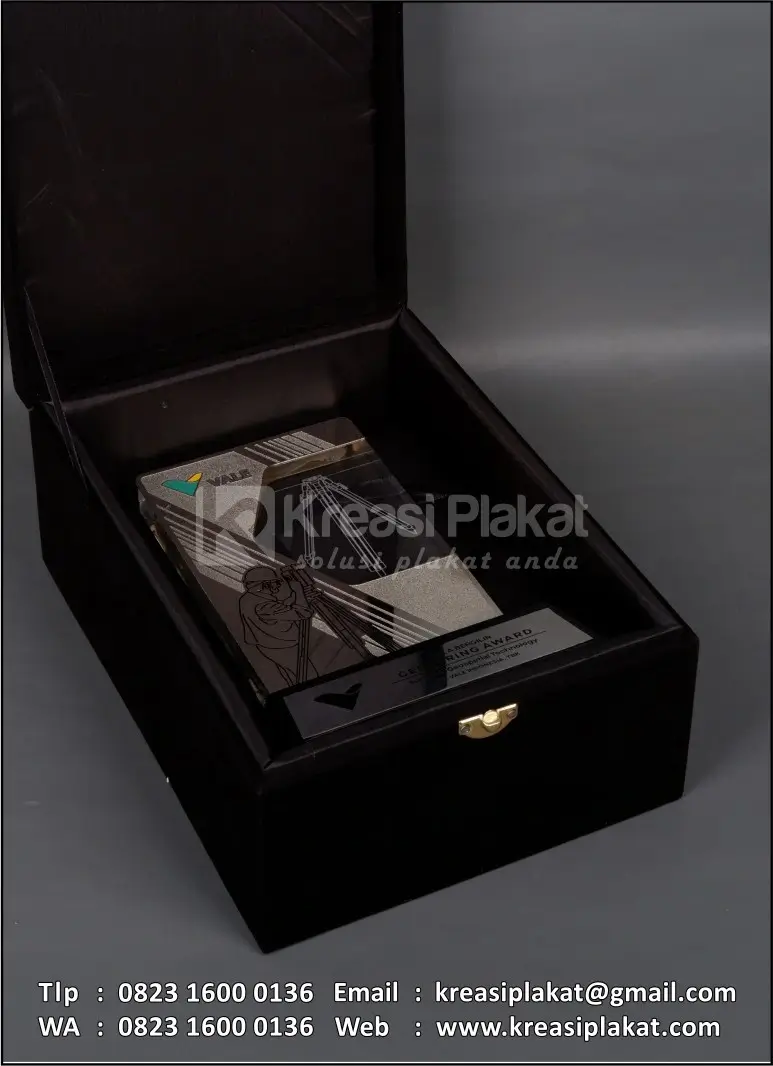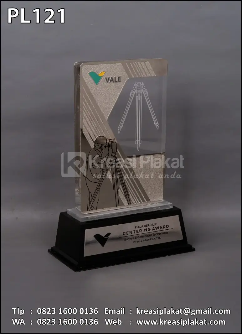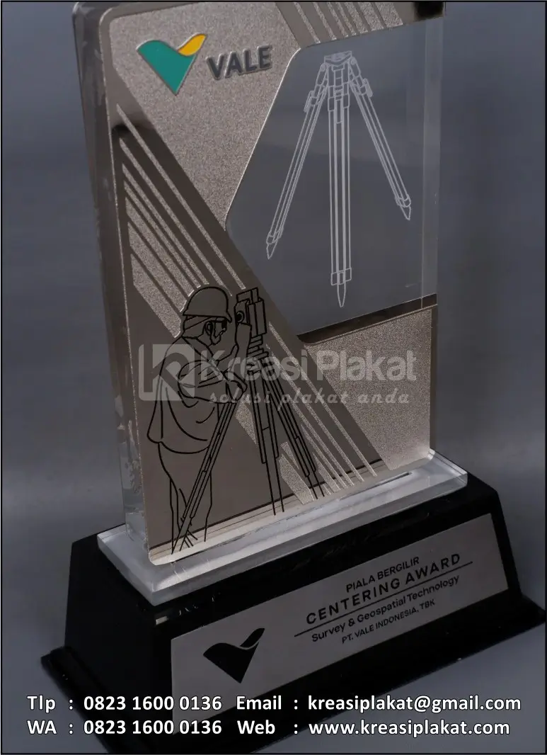 Salah satu bentuk penghargaan piala bergilir Centering Award PT Vale Indonesia Tbk yang menggunakan plakat sebagai medianya. Plakat yang bisa jadi pilihan referensi desain untuk Anda. Terbuat dari perpaduan bahan logam dan akrilik. Bahan logam kuningan finishing etsa masir chrome nickel + kombinasi akrilik grafir model desain custom. Untuk bagian dudukan menggunakan bahan kayu finishing hitam doff.