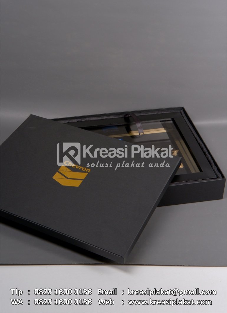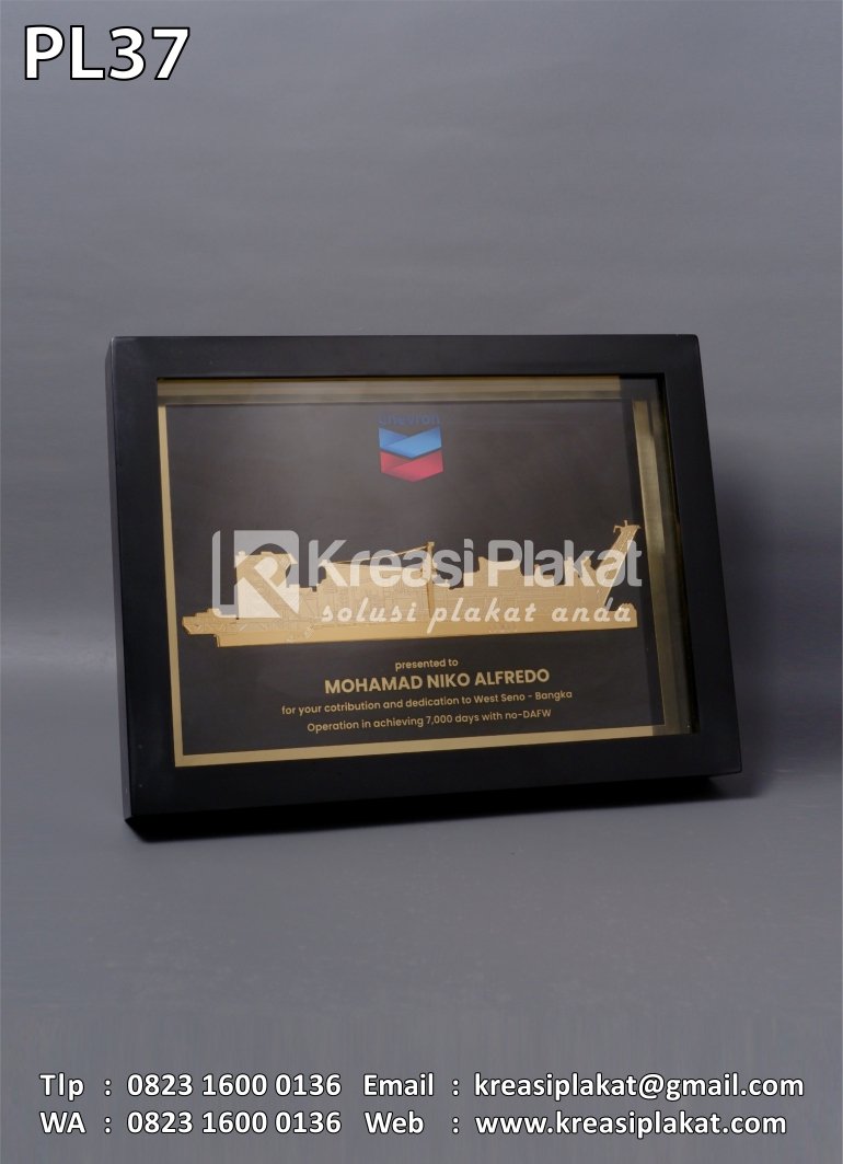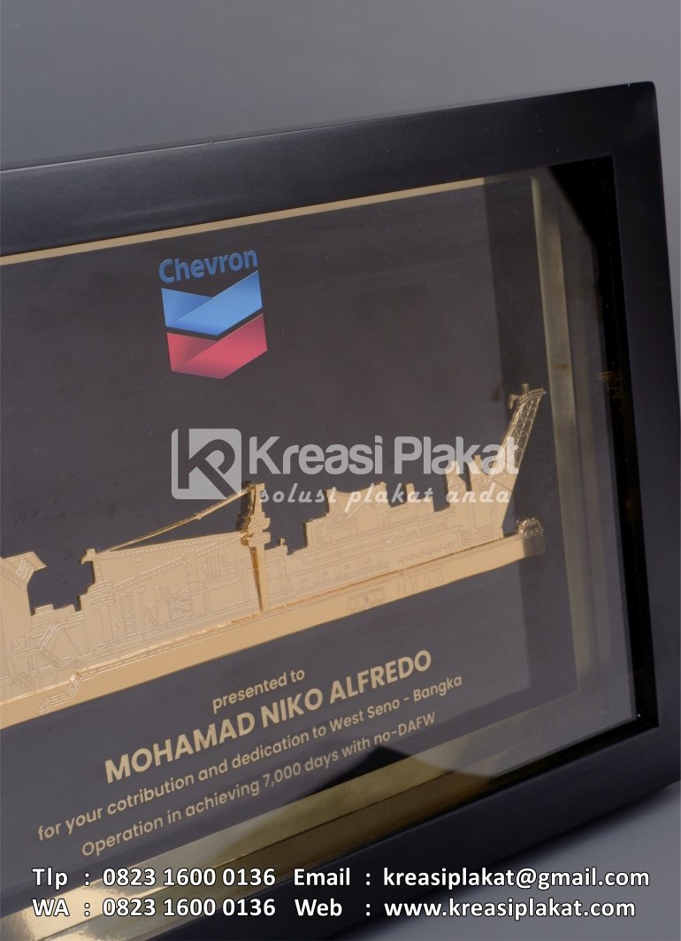 Salah satu bentuk penghargaan atau tanda mata kenangan yang berkelas berupa plakat. Plakat yang bisa jadi pilihan referensi desain untuk Anda. Terbuat dari bahan dasar kayu dengan warna hitam doff dalam bentuk model frame. Untuk isian materi pada plakat menggunakan bahan logam kuningan finishing chrome emas dalam bentuk siluet anjungan lepas pantai (offshore) dan tulisan.