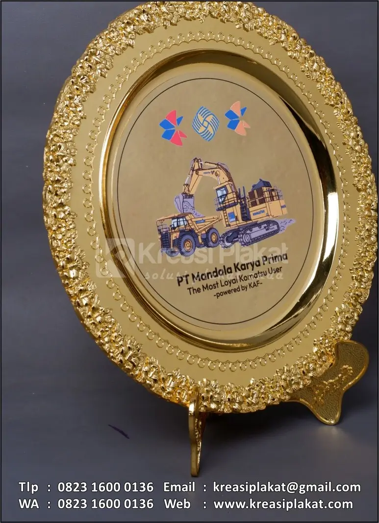 Salah satu bentuk penghargaan The Most Loyal Komatsu User PT Mandala Kriya Prima yang menggunakan plakat sebagai medianya. Plakat yang bisa jadi pilihan referensi desain untuk Anda. Terbuat dari bahan logam kuningan finishing chrome gold plated & uv print model desain custom piringan